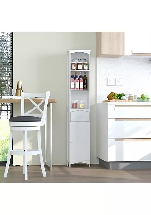 – Includes three level open shelves, one middle drawer, and a bottom cupboard
