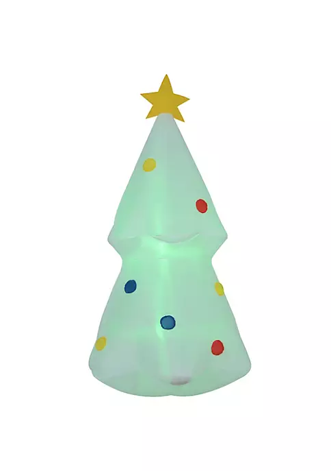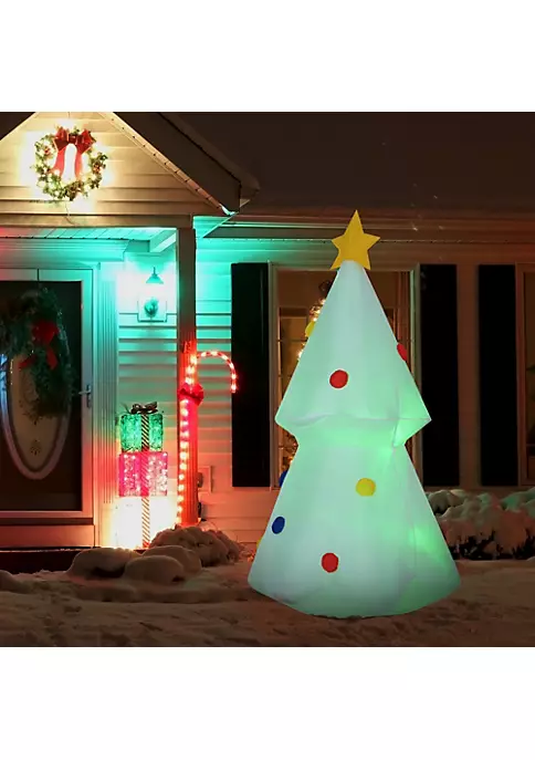 – 6-foot tall yard inflatable Christmas tree features a white, snow-covered Christmas tree with multicolor lights and a golden star on top.