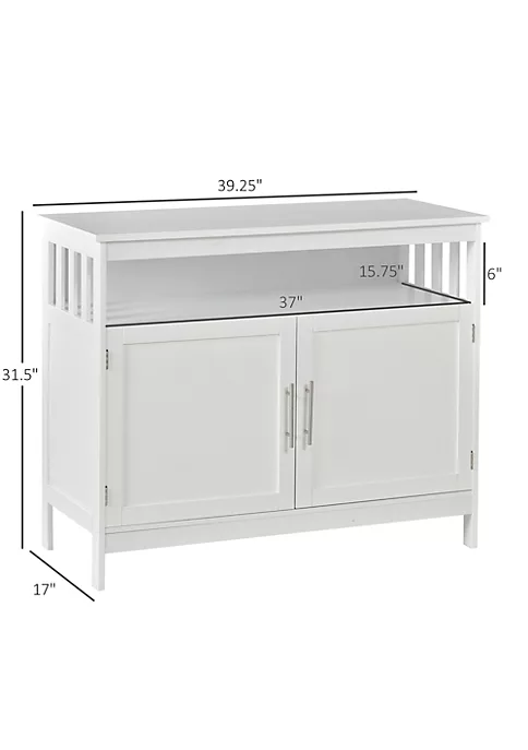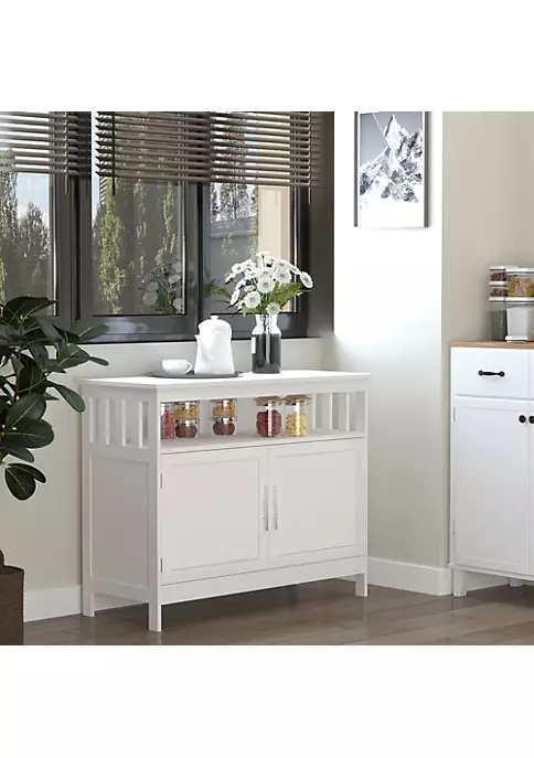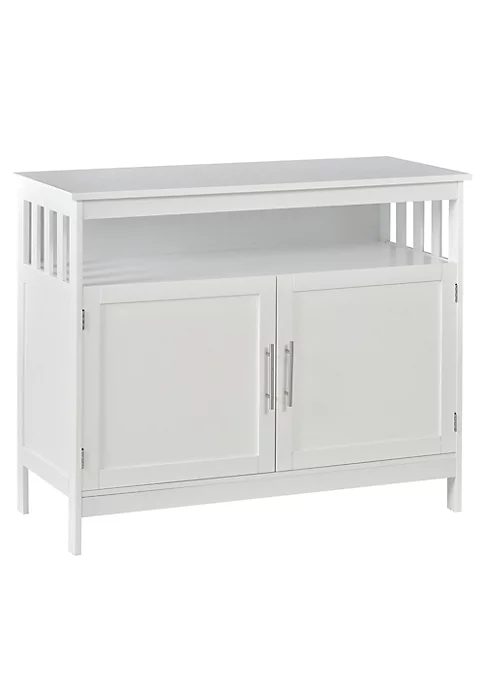 – A cabinet, an open shelf, and a wide countertop for storage and organization