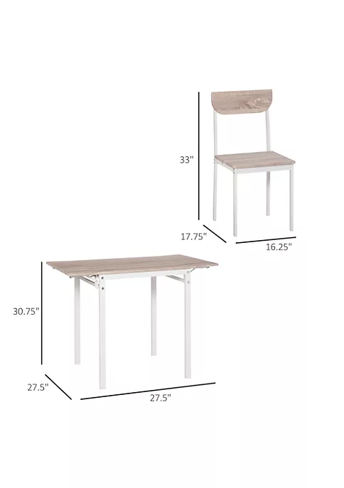 – Color: White; – Material: MDF, Steel; – Table Dimensions: 27.5″ L x 27.5″ W x 30.75″ H (folded), 43.25″ L x 27.5″ W x 30.75″ H (extended); – Chair Dimensions: 16.25″ W x 17.75″ D x 33″ H; – Seat Dimensions: 15.75″ W x 15″ D x 17.5″ H; – Back Length: 15.75″; – Weight Capacity: 220lbs (table), 286lbs (chair); – Item Label: 835-352;