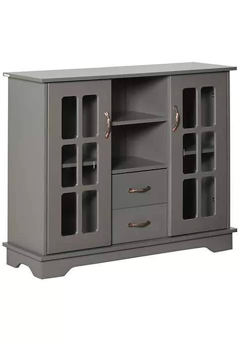 – Modern design fits your living room, dining room, and kitchen; – Ample storage space including two glass door cabinets, two drawers, and two storage shelves helps you organize your items easily; – Suitable for the storage of daily necessities, snacks, tableware, or flavor boxes.; – Muti-function as a sideboard, kitchen cabinet, or a display stand; – Sturdy frame built of good-quality materials; – Anti-toppling device equipped; – Assembly required;