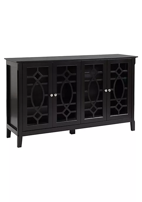 – Large storage space with 2 enclosed cabinets for holding daily accessories and utensils; – Equipped with 2 adjustable shelves to accommodate items of various heights; – Glass doors with scrolled framing allow you to display decorative dishware or cherished keepsakes and keep out the dust; – Can be used as a buffet, storage cabinet and TV console; – Fits dining room, kitchen, living room or other limited spaces needing a bit more storage; – Made of MDF and glass for durability and easy cleaning; – Features an anti-toppling design and can be fixed to the wall for safety; – Required assembly;